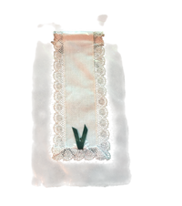 Small Wall Haning Aide cloth with ribbon and lace. This has a green rod and ribbon. The dowel rod is 5 inches long. The length is 8 inches in total. The stitch area is 2”x6 1/2”