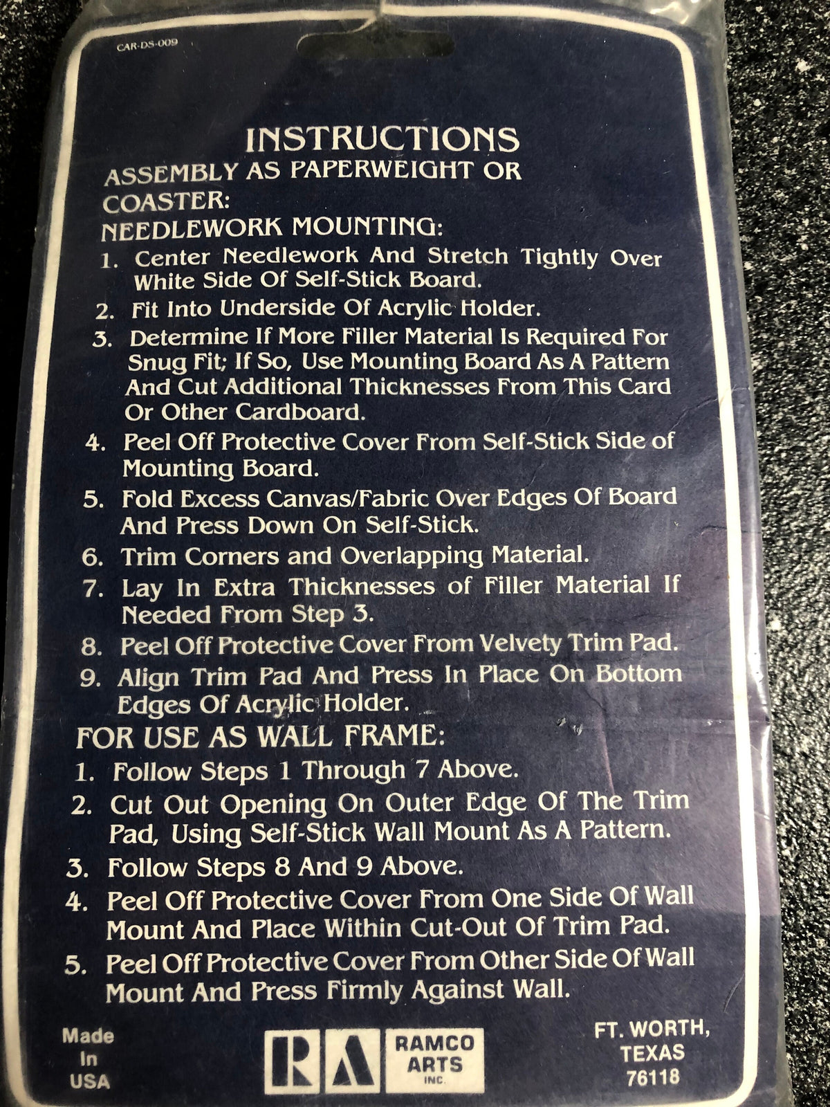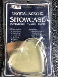 Crystal Acrylic Showcase Paperweight Coaster Frame Display your: Cross Stitch Stenciling Needlepoint Quilting Photos Mementos Includes: Break resistant acrylic heart shaped holder Self stick mounting board Velvety Trim Pad Assemble instructions on back.