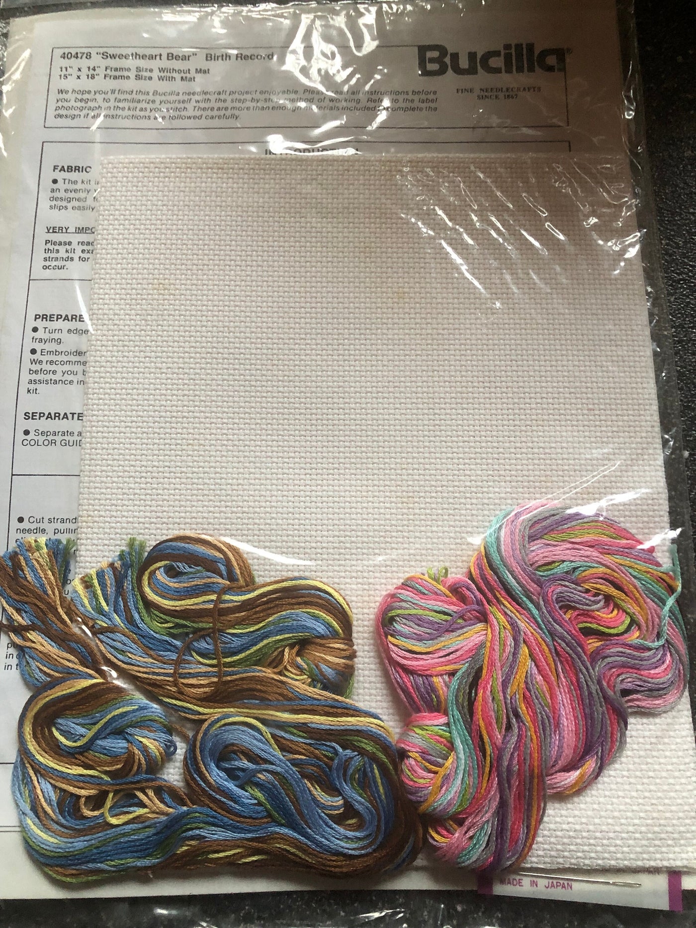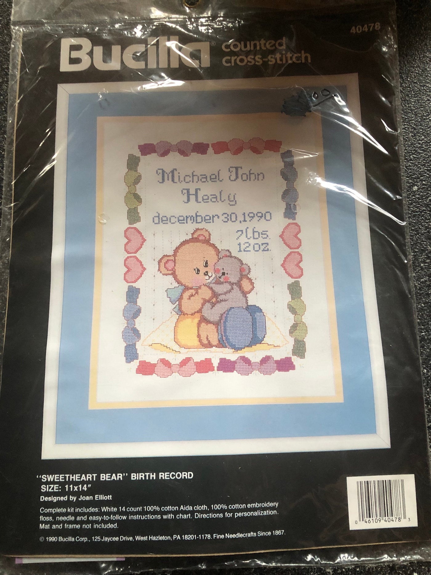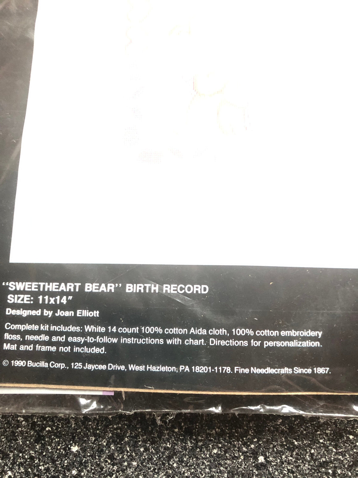 Sweetheart Bear Birth Record Counted Cross Stitch Kit by Bucilla Kit #40478 Size 11 x 14" Designed by Joan Elliott Complete kit includes : White 14 count 100% cotton Aida cloth, 100% cotton embroidery floss, needle and easy to follow instructions with chart. Directions for personalization. Mat and frame not included.