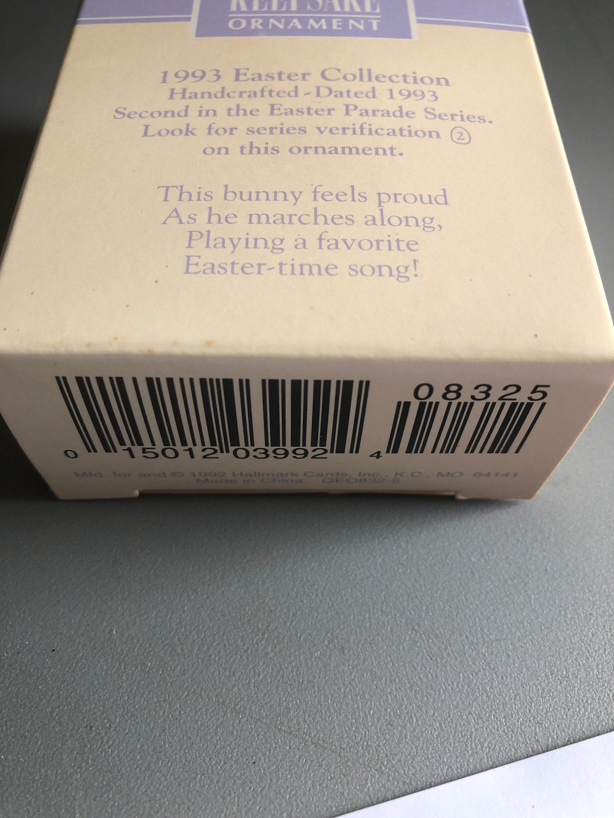 This is an Easter Hallmark Keepsake Ornament Easter Parade In it’s original box with tags. 1993 Easter Collection Handmade - Dated 1993 Second in the Easter Parade Series This bunny feels proud. As he marches along. Playing a favorite Easter-time song. Please look at the photos carefully for the condition of the box.