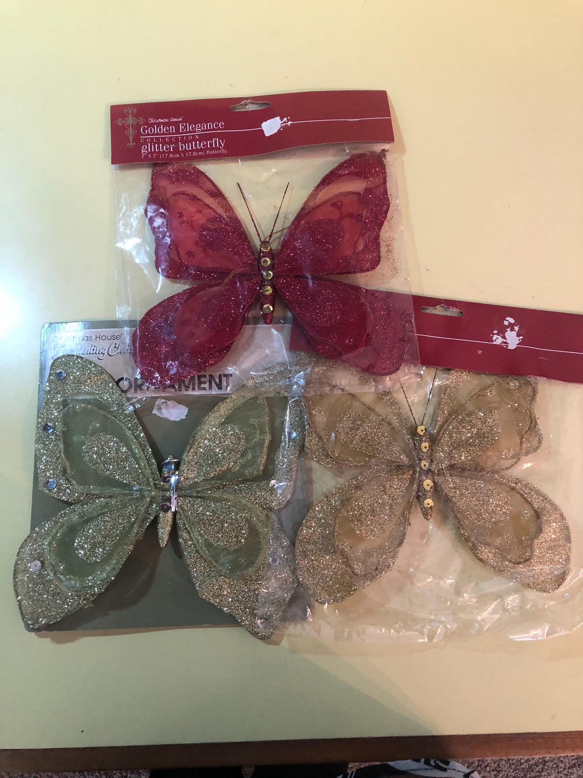 Glitter Butterflies Size 7”x7” Red and old are by Golden Elegance Green is by Christmas House
