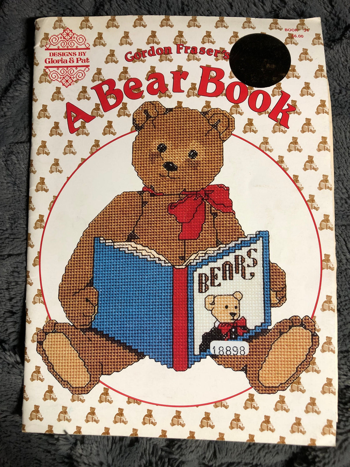 Gordon Fraser’s A Bear Book Cross Stitch Patten Book Designs by Gloria & Pat This 40 page book contains 21 Cross stitch patterns and the alphabet. These are counted cross stitch patterns that can also be completed as needlepoint. This booklet is from 1984. It was purchased new from a craft store that has gone out of business. The Corners are slightly rounded with age and there is a slight ripple/crease in the upper right corner.