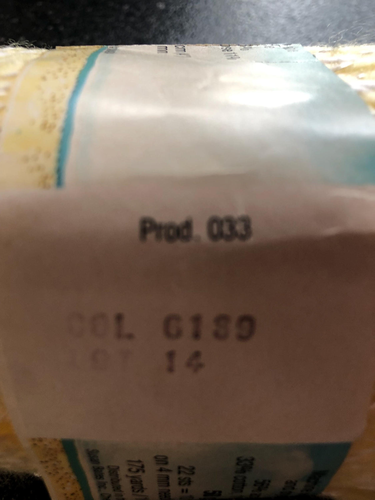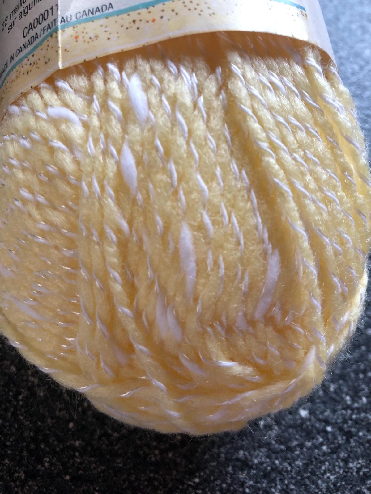 Patons Cotton Club Vintage Yarn Color: Yellow & White G189 machine washable and dryable 56% Acrylic, 33% Cotton, 11% Viscose 50g 22 sts = 10 cm (4”) on 4mm needles. US 6. 175 yards / 160 meters Dustributed in the US by Susan Bates Inc Chester, Conn 06414 Made in Canada