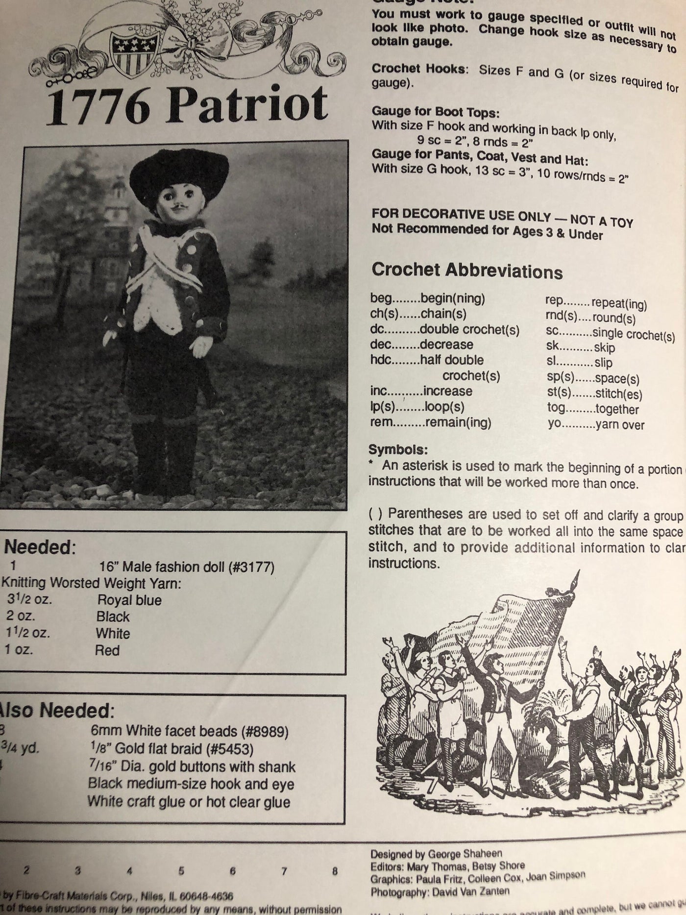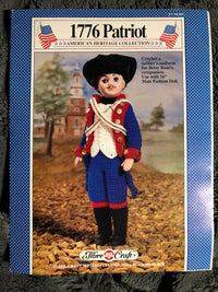 1776 Patriot American Heritage Collection Crochet a soldier’s uniform for Betsy Ross’s companion. Use with 16” Male Fashion Doll. By Fibre-craft Materials Corp. Crochet pattern leaflet from 1989. This is a old pattern never used. The corners may be slightly rounded from storage. This is a patten leaflet new from a craft store that has gone out of business.