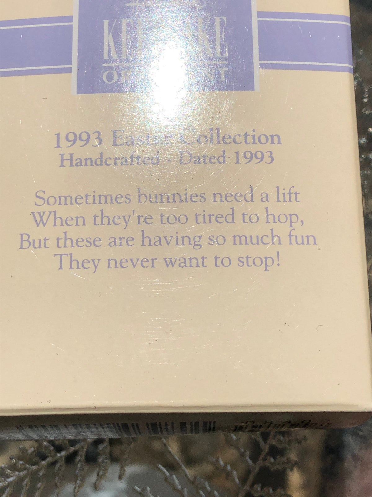 This is an Easter Hallmark Keepsake Ornament Barrow of Giggles In it’s original box with tags. 1993 Easter Collection Handmade - Dated 1993 Box states: Sometimes bunnies need a lift. When they’re too tired to hop. But these are having so much fun. They never want to stop! Please look at the photos carefully for the condition of the box. There is slight crease on the front left.
