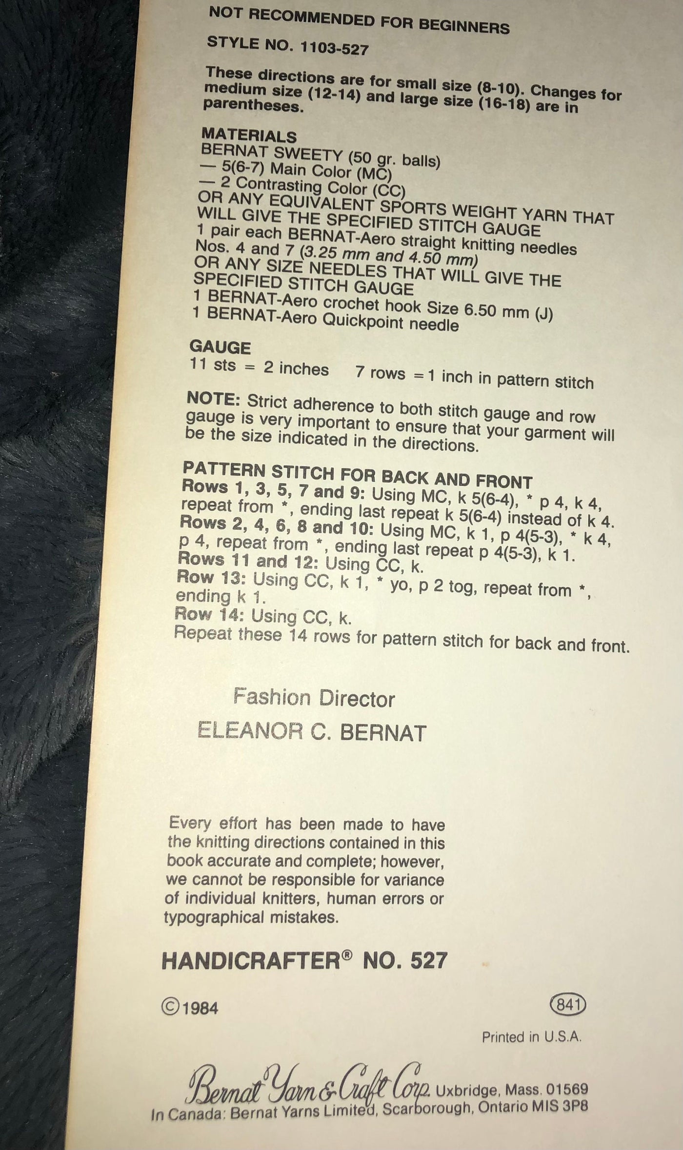 Bernat Book No 527 Berella 4 Sweety Vintage Knitting Pattern for two sweaters. Pattern from 1984. This item is new from a craft store that has long been out of business. The bottom left corner is creased as if someone used it to fan themselves on a hot day at some point in time. Bottom edge appears slightly rough.