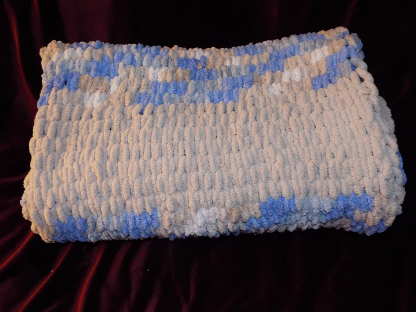 Blue White and Gray Throw / Baby Blanket. Knit Style made with Loop yarn. 42 inches lone by 37 inches wide. All handmade items are made by a disabled senior with love. Blankets are all made stretchy. For the life of me I do not know how anyone photographs these perfectly straight. As a craft lover I have collected patterns, kits and materials. Over time fellow craft lovers have passed on to me their collections. Sadly, I realize that the current collection could not be completed in my lifetime. This will be to your advantage. Many items are now still in original packages. I will do my very best to accurately describe these items. If there is writing or damage to a package. I will try to note it for you and include photos. For best description all of these items will be referred to as estate items. As they have been acquired over time from various homes, I cannot make any statement on pets or smoke.
