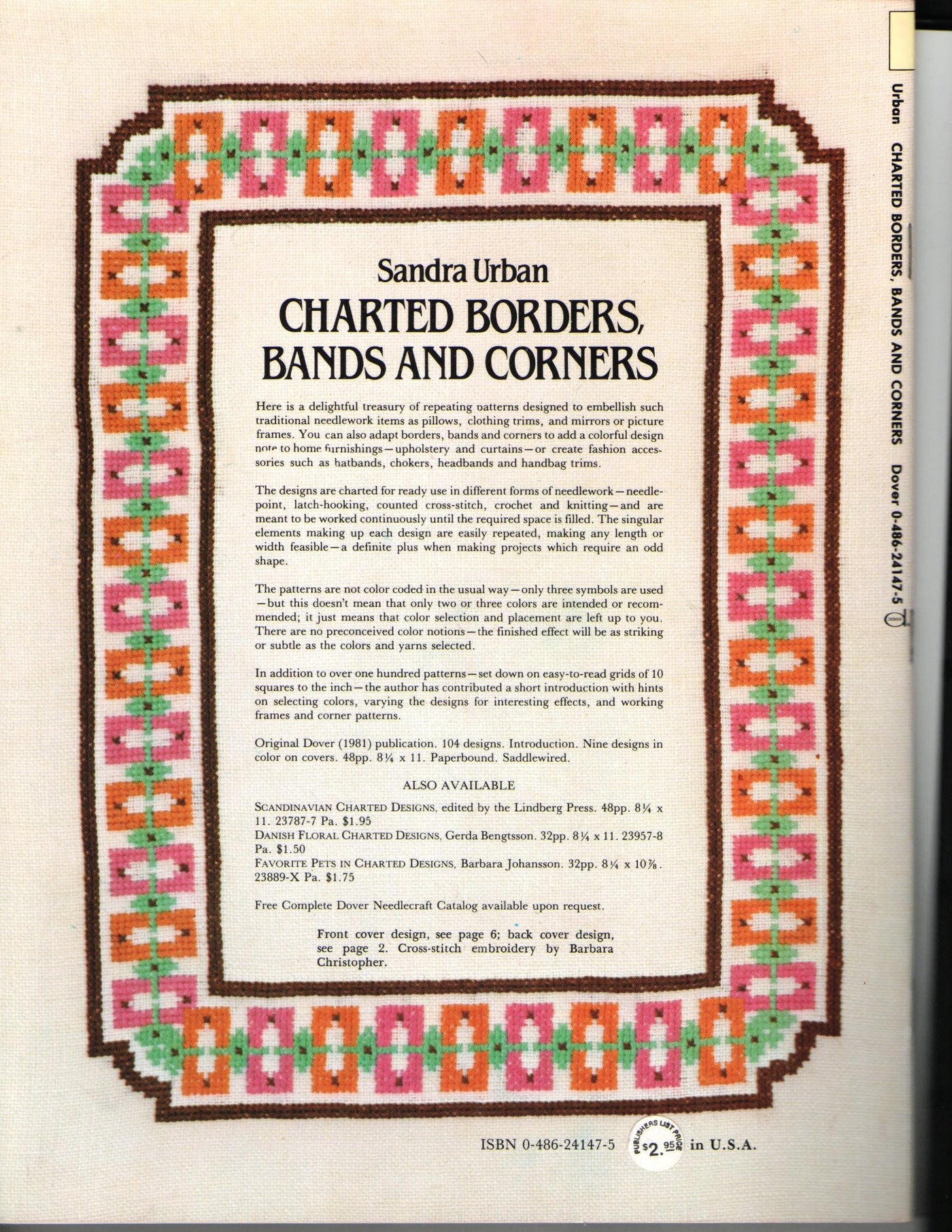 Chartered Borders, Bands and Corners PB Book By Sandra Urban Dover Needlework Series With 104 Designs for Cross Stitch, Needlepoint, Latch-Hooking, ETC. This is a 42-page book new from a craft store that has gone out of business.