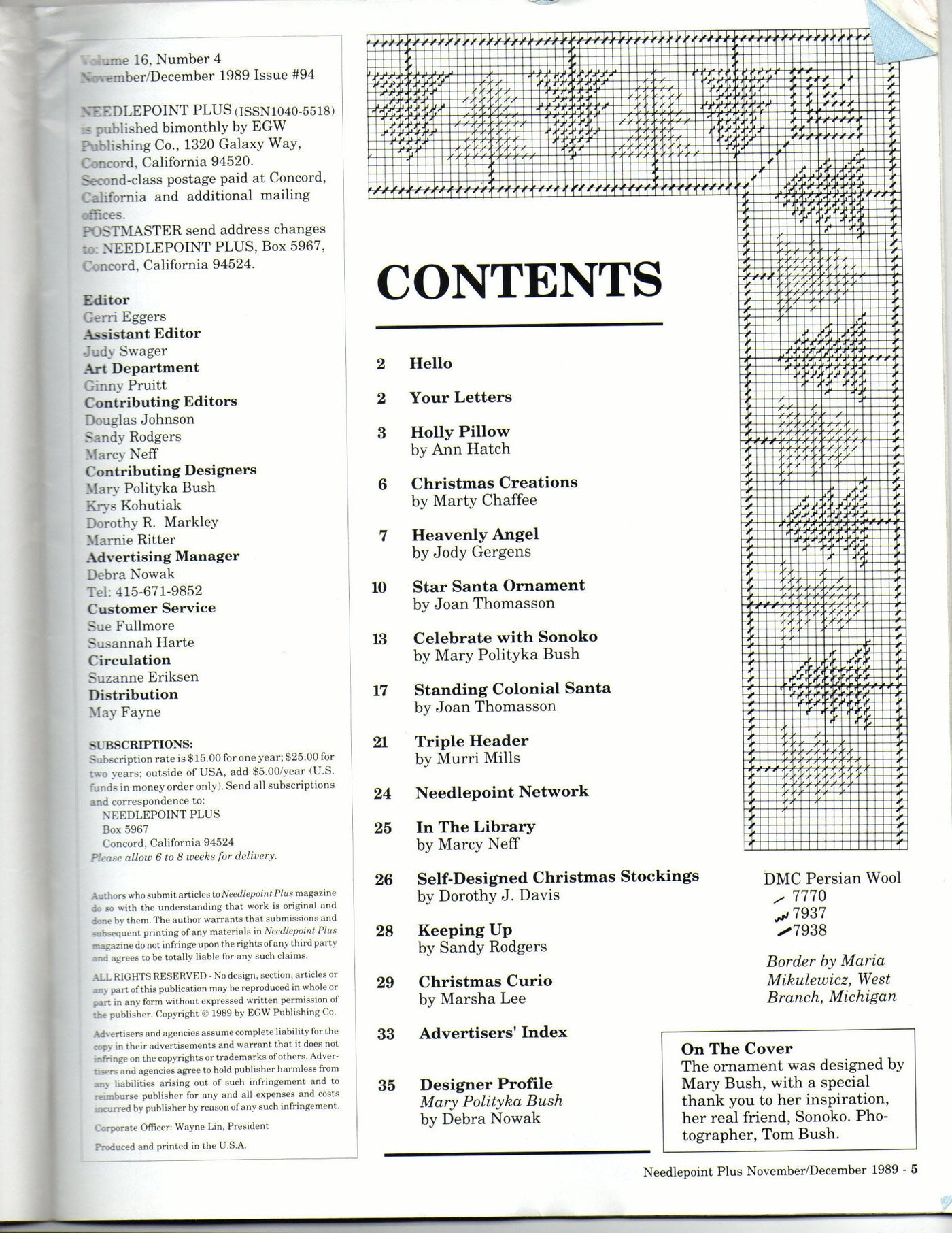 Needlepoint Plus Magazine November December 1989 Formerly Needlepoint News This is a estate item in acceptable condition. There are pages folded over. A small rip on the upper right corner.