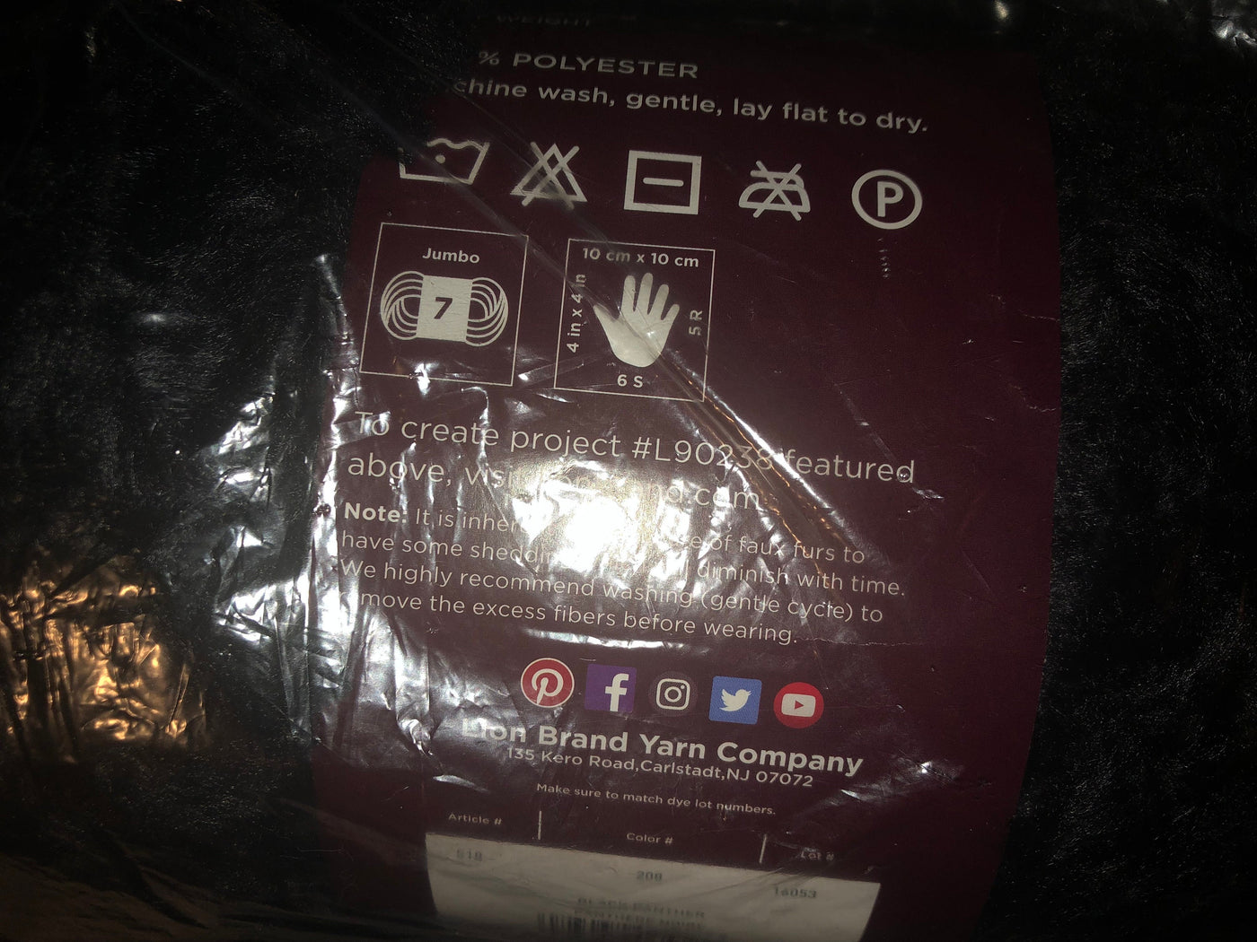 Off The Hook Faux Fur Lion Brand Yarn Pre Looped Color: Black Panther No tools needed. Size 7 Jumbo 7oz 200g 100% Polyester Machine Wash Gentle. Lay flat to dry.