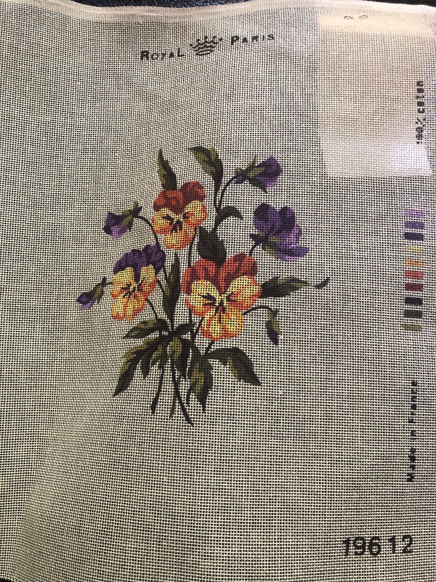 Orange & Purple Pansies 196-12 Royal Paris Painted Canvas The stitch area is approximately 9 x 7 inches. Made in France