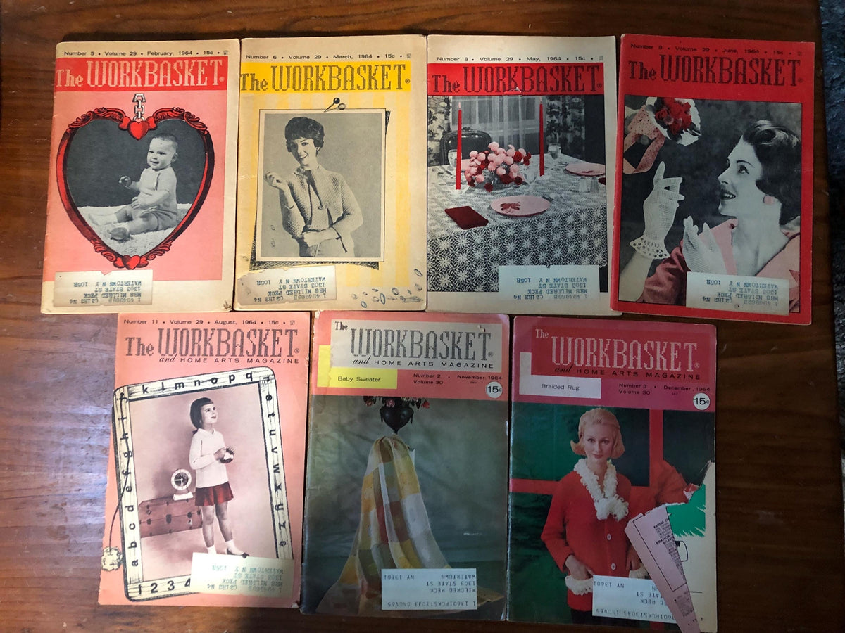 The Work Basket Magazine Home and Needlecraft For Pleasure And Profit This is a set of vintage magazines. Considering these are around 60 years old they are in fairly good shape. The pages have yellowed the age max the corners are rounded. There are minor rips in a cover or two. label from original owner remains on some. 1964 February March May June August November December see photos for crafts you will find inside.