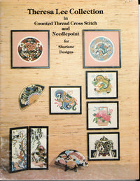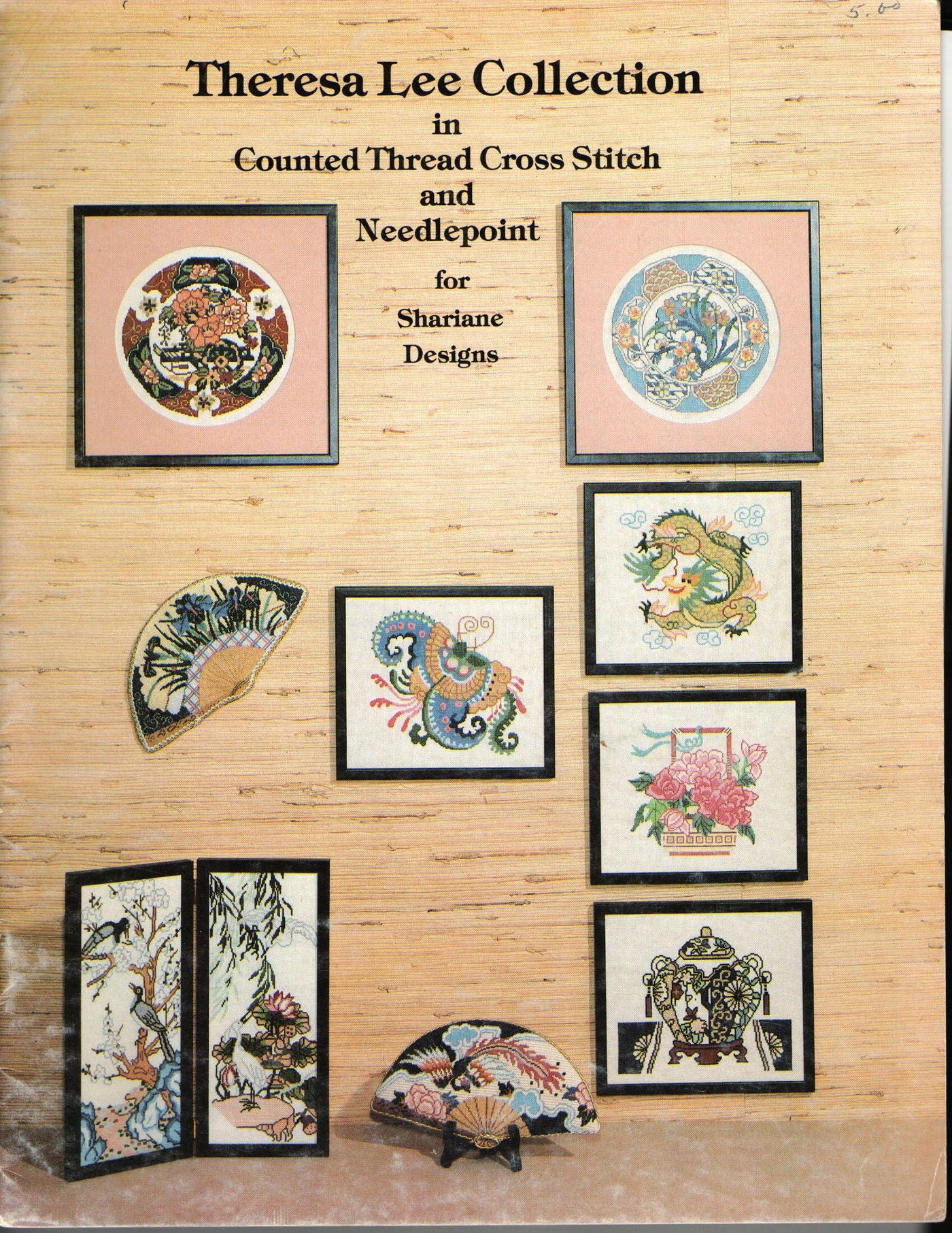 Theresa Lee Collection In Counted Thread Cross Stitch And Needlepoint For Shariane Designs Booklet This has oriental designs. The cover is worn and has rounded edges with a small crease in the lower right corner.