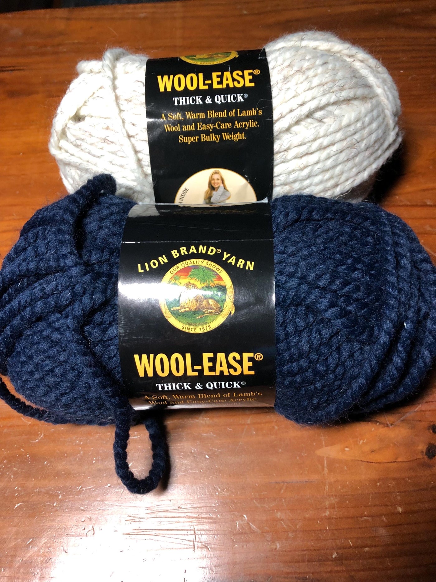 Wool-Ease Thick & Quick Lion Brand Yarn A soft, warm blend of Lamb’s wool and Easy-care Acrylic. super Bulky Weight. 6oz 86% Acrylic 10% Wiol 4% Rayon